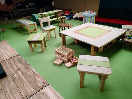 L’espace est divisé en quatre parties : un vestiaire, un coin détente, une salle de motricité pour les enfants et une salle de bloc. Ici, tout est conçu grâce à la revalorisation de divers matériaux : palettes, tissus, anciens matelas, copeaux de bois, … dans une démarche responsable.