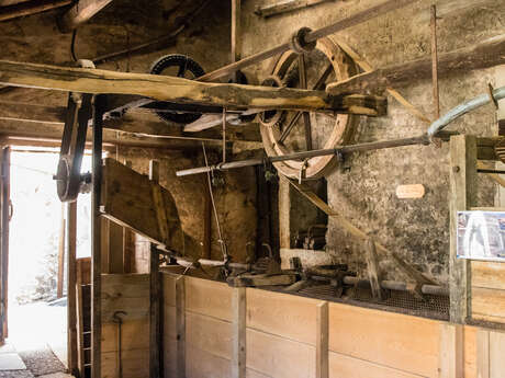 Nous nous dirigeons vers l’arrière du bâtiment pour nous retrouver dans un cadre verdoyant et paisible et nous arrêtons un moment le long du canal pour écouter l’histoire du « chemin de l’eau » qui guidait autrefois l’eau de la Vôge vers la grande roue du moulin.